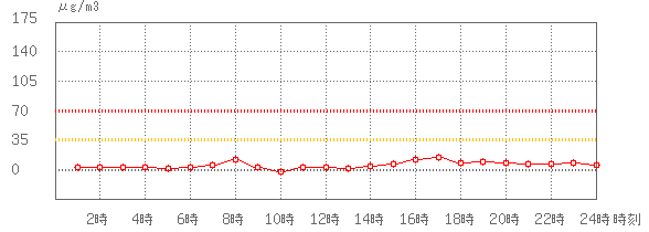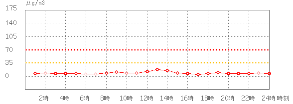 ※グラフのデータである1時間値とは直接比較できませんが、35µg/m3 (環境基準:1日平均)、70µg/m3 (注意喚起暫定指針:1日平均)に参考として線を記載しています。