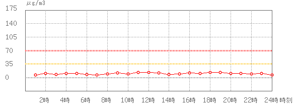 ※グラフのデータである1時間値とは直接比較できませんが、35µg/m3 (環境基準:1日平均)、70µg/m3 (注意喚起暫定指針:1日平均)に参考として線を記載しています。