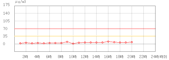 ※グラフのデータである1時間値とは直接比較できませんが、35µg/m3 (環境基準:1日平均)、70µg/m3 (注意喚起暫定指針:1日平均)に参考として線を記載しています。