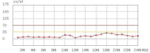 ※グラフのデータである1時間値とは直接比較できませんが、35µg/m3 (環境基準:1日平均)、70µg/m3 (注意喚起暫定指針:1日平均)に参考として線を記載しています。
