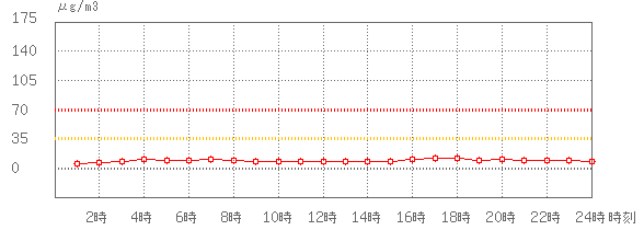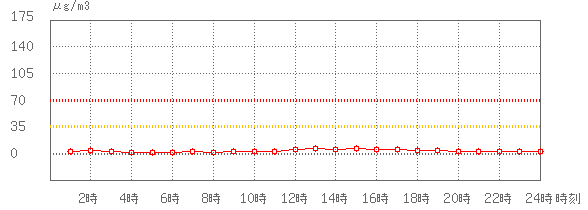 ※グラフのデータである1時間値とは直接比較できませんが、35µg/m3 (環境基準:1日平均)、70µg/m3 (注意喚起暫定指針:1日平均)に参考として線を記載しています。