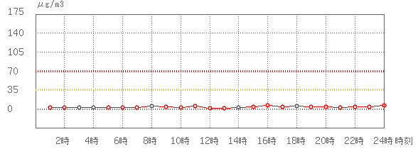※グラフのデータである1時間値とは直接比較できませんが、35µg/m3 (環境基準:1日平均)、70µg/m3 (注意喚起暫定指針:1日平均)に参考として線を記載しています。