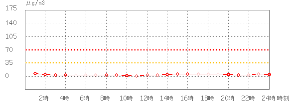 ※グラフのデータである1時間値とは直接比較できませんが、35µg/m3 (環境基準:1日平均)、70µg/m3 (注意喚起暫定指針:1日平均)に参考として線を記載しています。