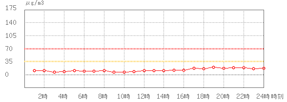 ※グラフのデータである1時間値とは直接比較できませんが、35µg/m3 (環境基準:1日平均)、70µg/m3 (注意喚起暫定指針:1日平均)に参考として線を記載しています。