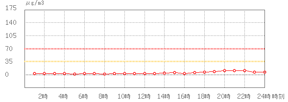 ※グラフのデータである1時間値とは直接比較できませんが、35µg/m3 (環境基準:1日平均)、70µg/m3 (注意喚起暫定指針:1日平均)に参考として線を記載しています。