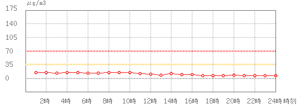 ※グラフのデータである1時間値とは直接比較できませんが、35µg/m3 (環境基準:1日平均)、70µg/m3 (注意喚起暫定指針:1日平均)に参考として線を記載しています。